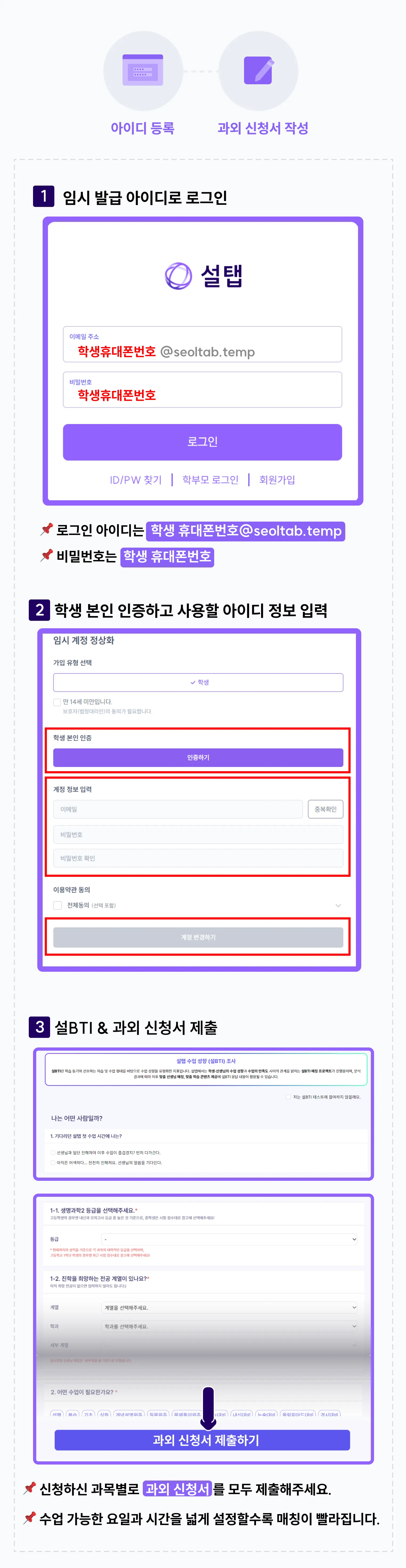 이제 학생 아이디를 등록하과외 신청서 작성만 하면 바로 설탭을 시작할 수 있어요!