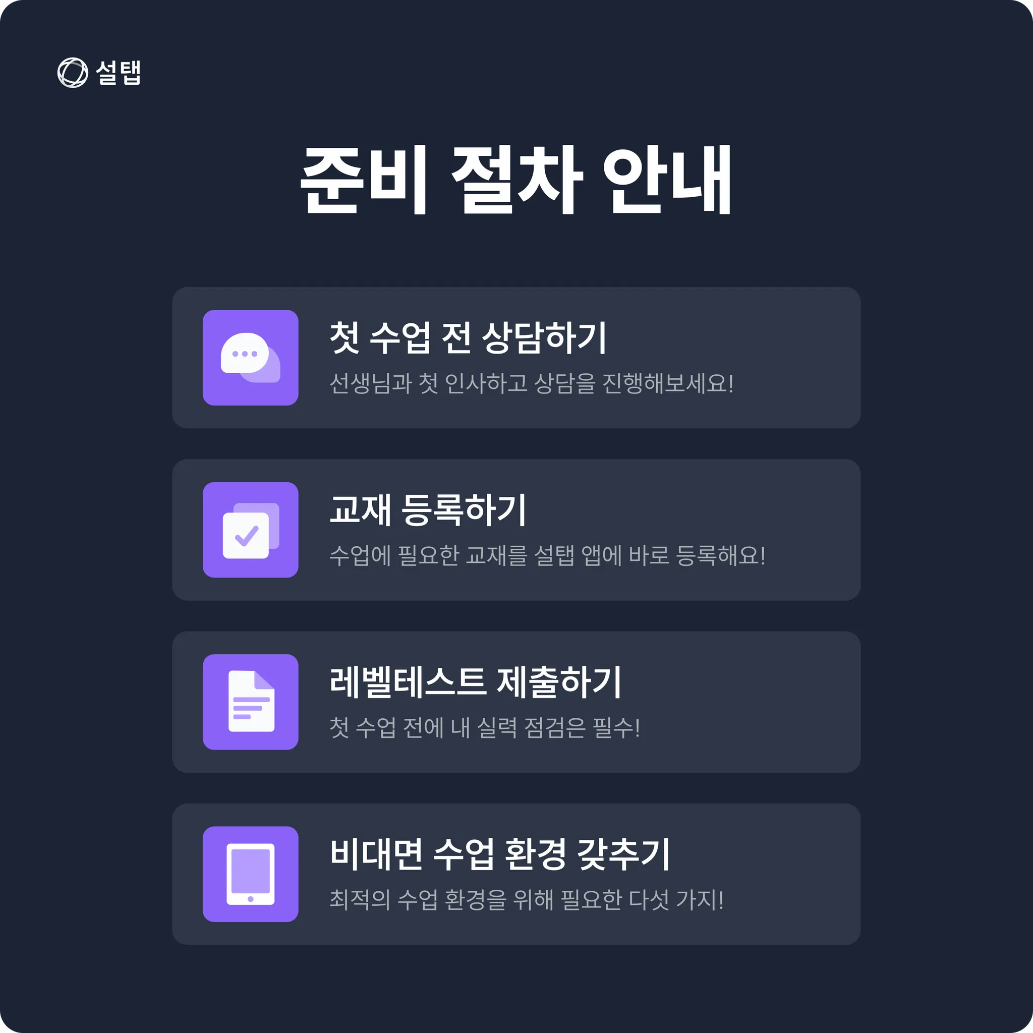 위 네 가지 내용을 확인하고 선생님과의 첫 수업을 잘 준비하셨나요? 그렇다면 이제 선생님과의 첫 수업만 남았어요!